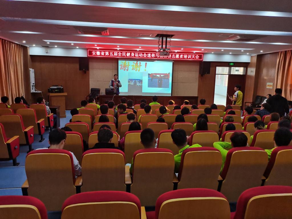 为确保安徽省第五届全民健身运动会迷你马拉松赛事的顺利进行,赛事组委会于10月8日在我校南阶205教室对 50名志愿者和各工作组老师进行了专门培训。