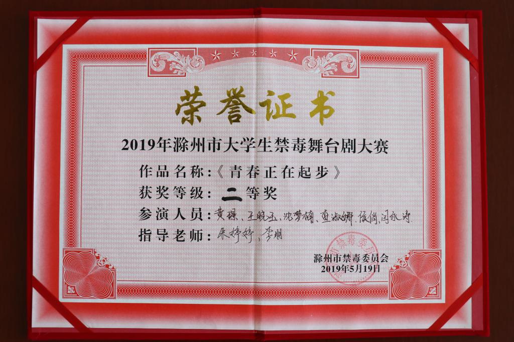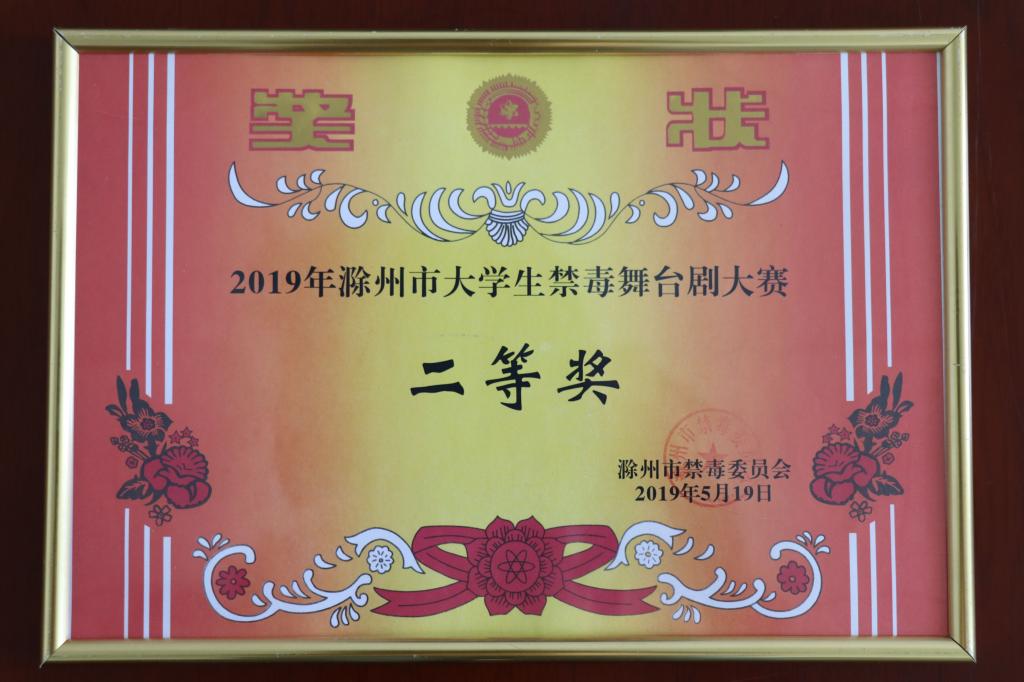 为贯彻落实习近平总书记关于禁毒工作的重要指示精神和党中央、国务院的决策部署,深入推进全市青少年毒品预防教育工程,全面提高大学生的禁毒意识和防毒、拒毒的能力。5月19日下午,由滁州市禁毒委员会办公室、滁州市教育体育局、滁州文化和旅游局、共青团滁州市委员会共同主办的滁州市大学生禁毒舞台剧大赛在滁州学院水上报告厅举行。我校大学生演出的剧目《青春正起步》荣获二等奖。