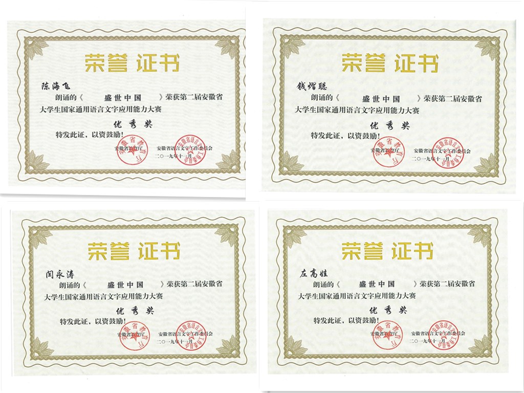 由安徽省教育厅、安徽省语言文字工作委员会主办,合肥工业大学承办的第二届安徽省大学生国家通用语言文字应用能力大赛在合肥工业大学隆重举行。我校左高娃、陈海飞、钱熠聪、闫永涛同学的朗诵作品《盛世中国》获得优秀奖。