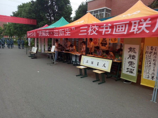9月23,皇家1396官方网站院书法协会联合滁州学院、城市学院,三校联合在皇家1396官方网站女生一号宿舍楼下举办庆国庆、迎新书法展。