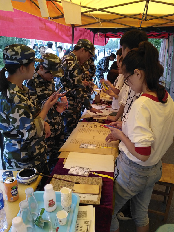 在此次活动中院书法协会成员现场为新生写赠字画,并为新生讲解书画知识。新生对此应热烈,军训结束后便结伴而来,他们留下很多的勉励的词让学长学姐写下挂在宿舍勉励自己,不少新生请学长学姐写感谢的话语送给他们军训教官,表达他们对教官近半个月的辛苦训练与陪伴。也有很多新生勇于尝试,自己亲手书写,体验软笔的魅力。更有不少有软笔功底的跃跃欲试,想小试牛刀。