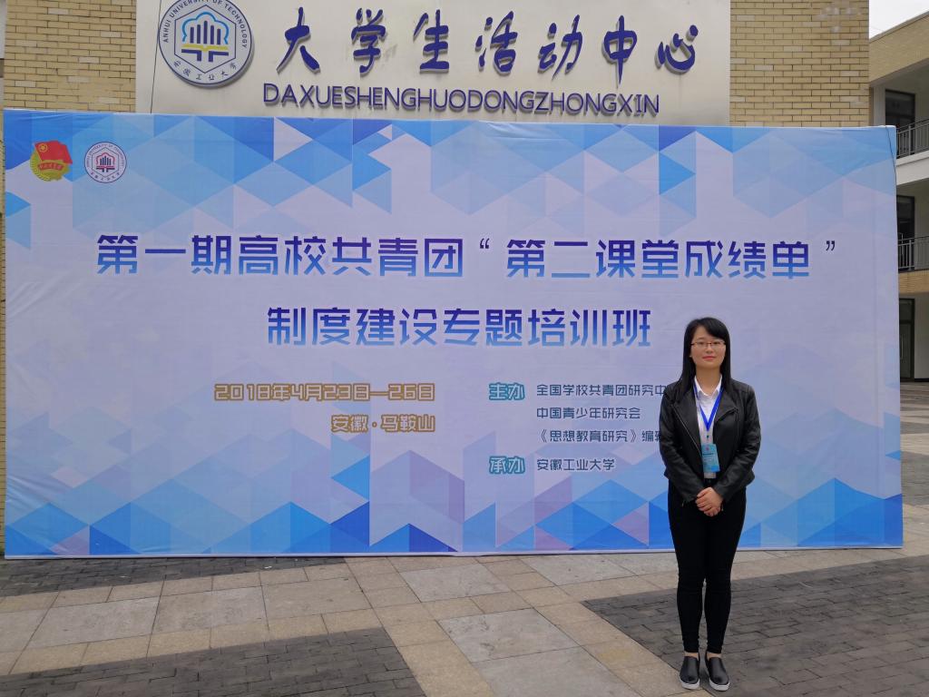 4月23日至26日,由全国学校共青团研究中心、中国青少年研究会、《思想教育研究》编辑部主办,安徽工业大学承办的第一期高校共青团“第二课堂成绩单”制度建设专题培训班在安徽工业大学举行。安徽工业大学党委书记刘新跃、团中央学校部副部长石新明、安徽团省委副书记张敏、全国学校共青团研究中心副主任秦涛、共青团安徽省委学校部副部长徐波出席了开班仪式,来自全国各地200余所高校的300余名团干部参加了培训。团委组织部部长谭康慧作为我院代表赴安徽工业大学参加了该专题培训班。