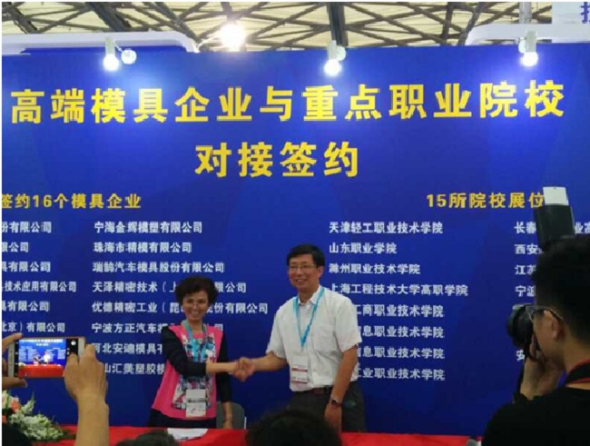 在展览会首日,中国模具工业协会举办了“高端模具企业与重点职业院校对接签约”活动,学校与企业代表分别上台介绍各自的特色和优势,拉近了彼此的距离,为今后精准合作打下了良好的基础。我院张信群教授与16家高端模具企业进行了洽谈,并与相关企业初步达成了合作意向。校企通过组建冠名订单班、组建实习实训基地、建立校企合作服务平台等,充分利用资源优势,更好地培养技术技能人才。